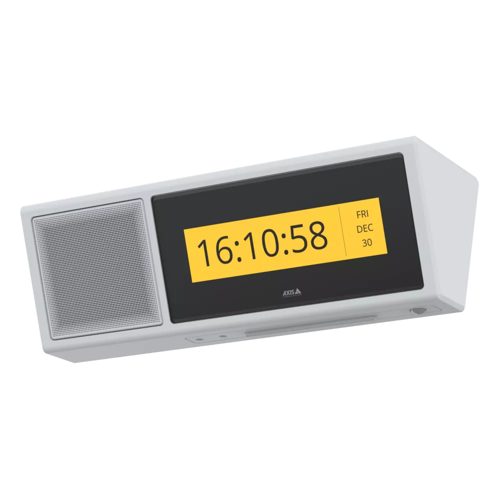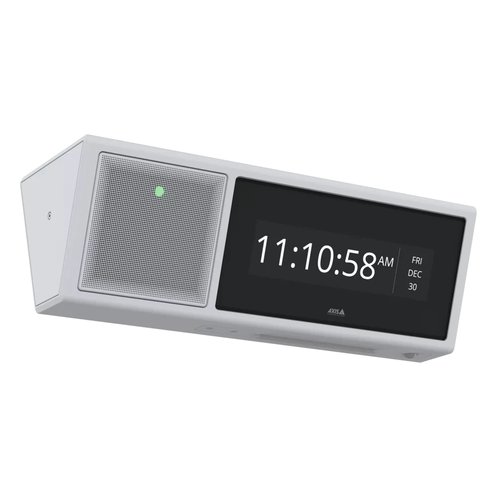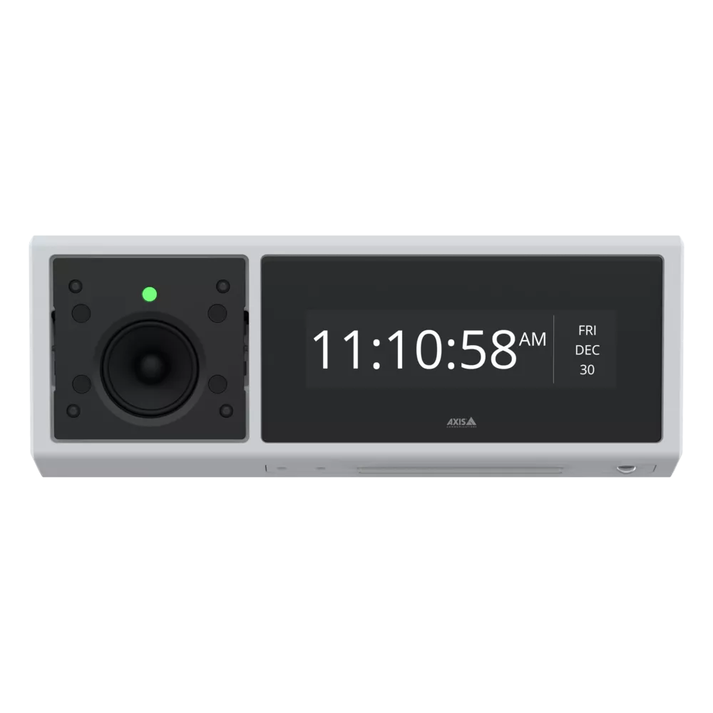 這款靈活的顯示揚聲器非常適合關鍵和非關鍵消息,幫助您確保人員安全和知情,保護您的財產,並提高效率和氛圍。相同的解決方案可以廣播鈴聲信號、鬧鐘和背景音樂。不使用時,顯示幕會顯示日期和時間。您還可以配置顯示揚聲器,以使用內置運動檢測器自動回應事件。為了獲得更多可能性,集成攝像機或其他安訊士設備,或利用開放式平臺集成第三方解決方案 – 例如,群發通知系統。