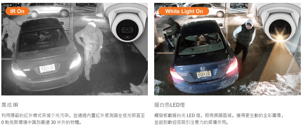 Q 系列 Al 雙光 Al 相機配備 3000K 暖白光 LED,可照亮光線昏暗的空間。與紅外線不同,暖白光允許在夜間進行顏色識別,並且不會洗掉反射表面。