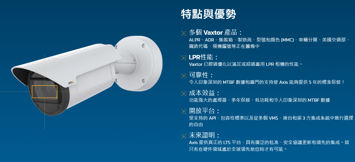 前端攝影機品牌,首推AXIS (www.axis.com),於2018年開始,Vaxtor 加入AXIS ACAP 計畫,在AXIS 攝影機上安裝VAXTOR 辨識軟體。並在交通領域上運用在車牌辨識/ADR (有害物質運輸車輛) /貨櫃號碼辨識 / 鐵路車廂辨識/飛機辨識。(ALPR、ADR、Container、MMC、Classification、TailFin)